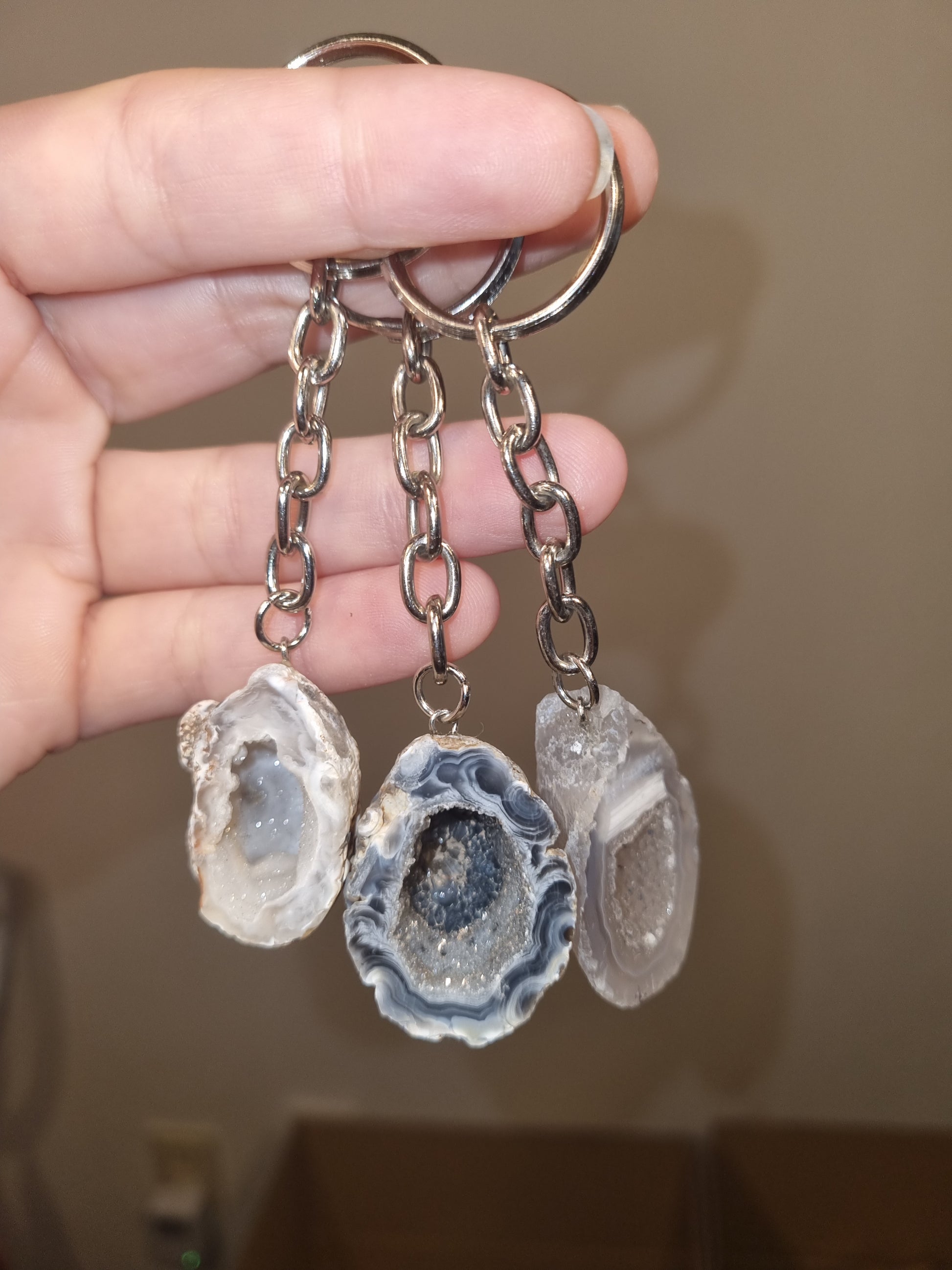 Deze sleutelhanger bestaat uit een (kleine) halve agaat geode die is gepolijst. De ring heeft een diameter van 2.5 cm en het geheel met ketting en geode is ongeveer 10 cm.