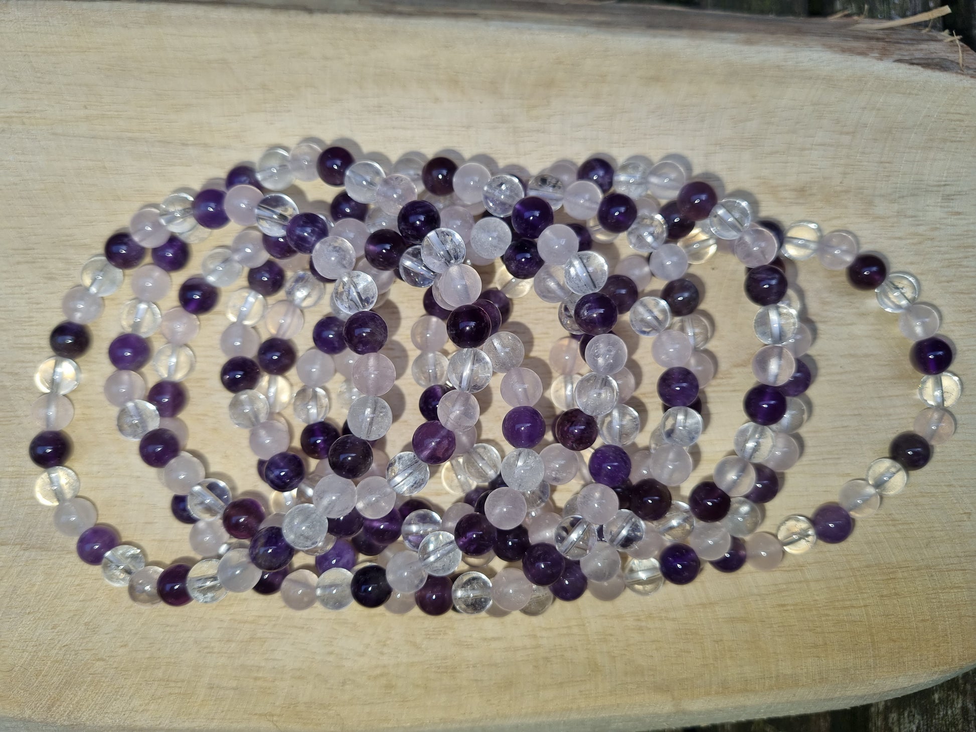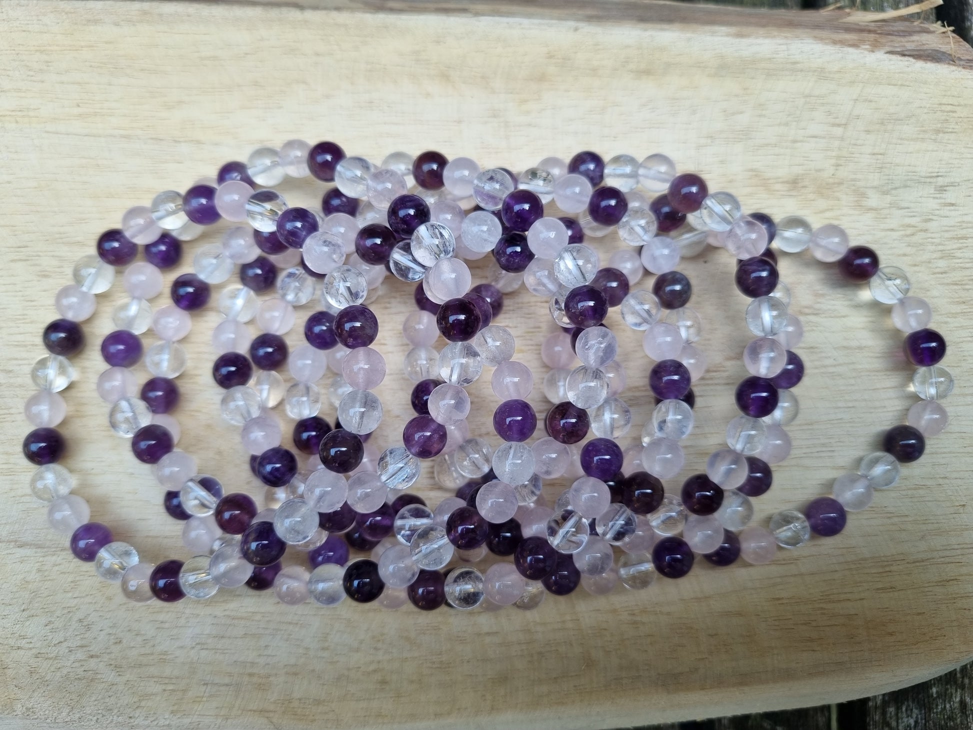 Onze gouden driehoek kogelarmband combineert de krachtige energieën van amethist, bergkristal en rozenkwarts in een elegant sieraad. De 6 mm kralen zorgen voor een subtiele maar opvallende uitstraling, perfect voor dagelijks gebruik.